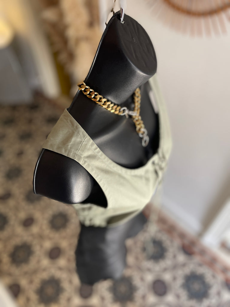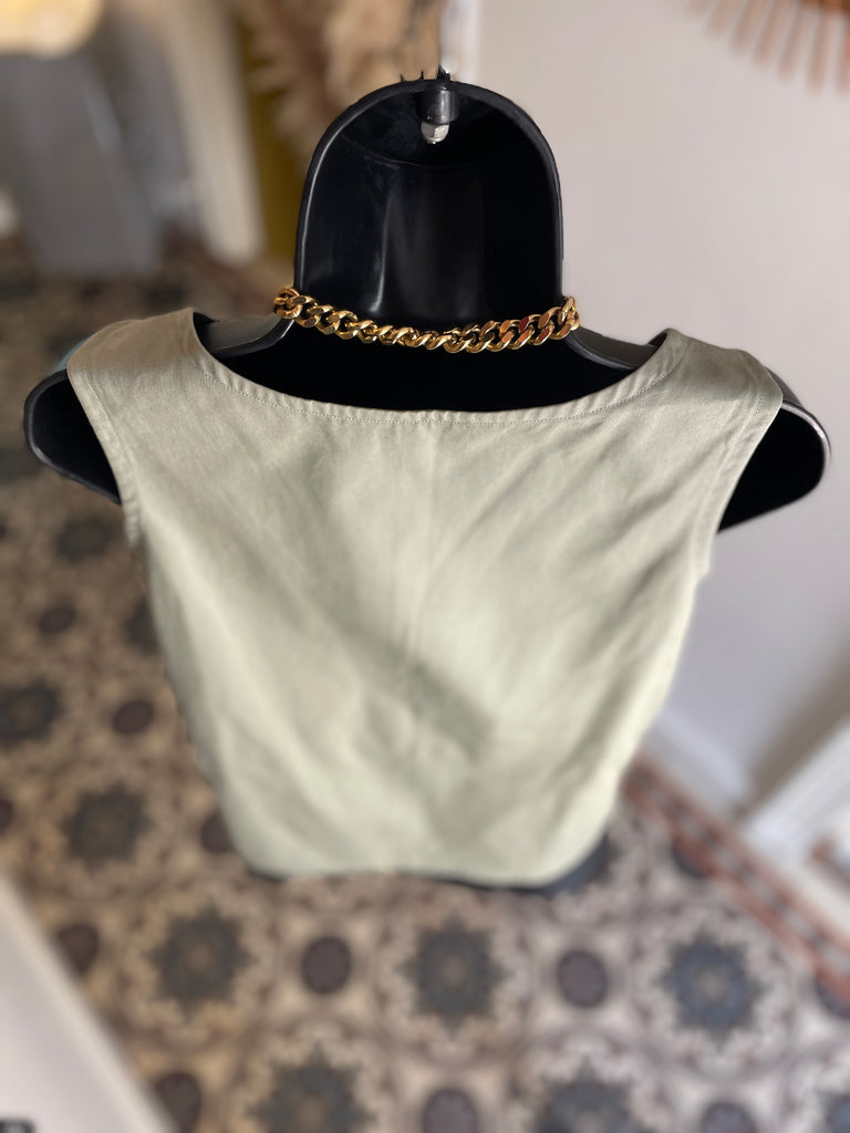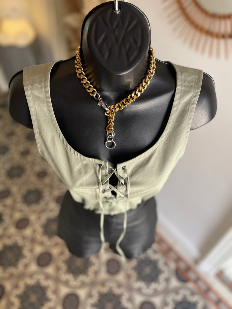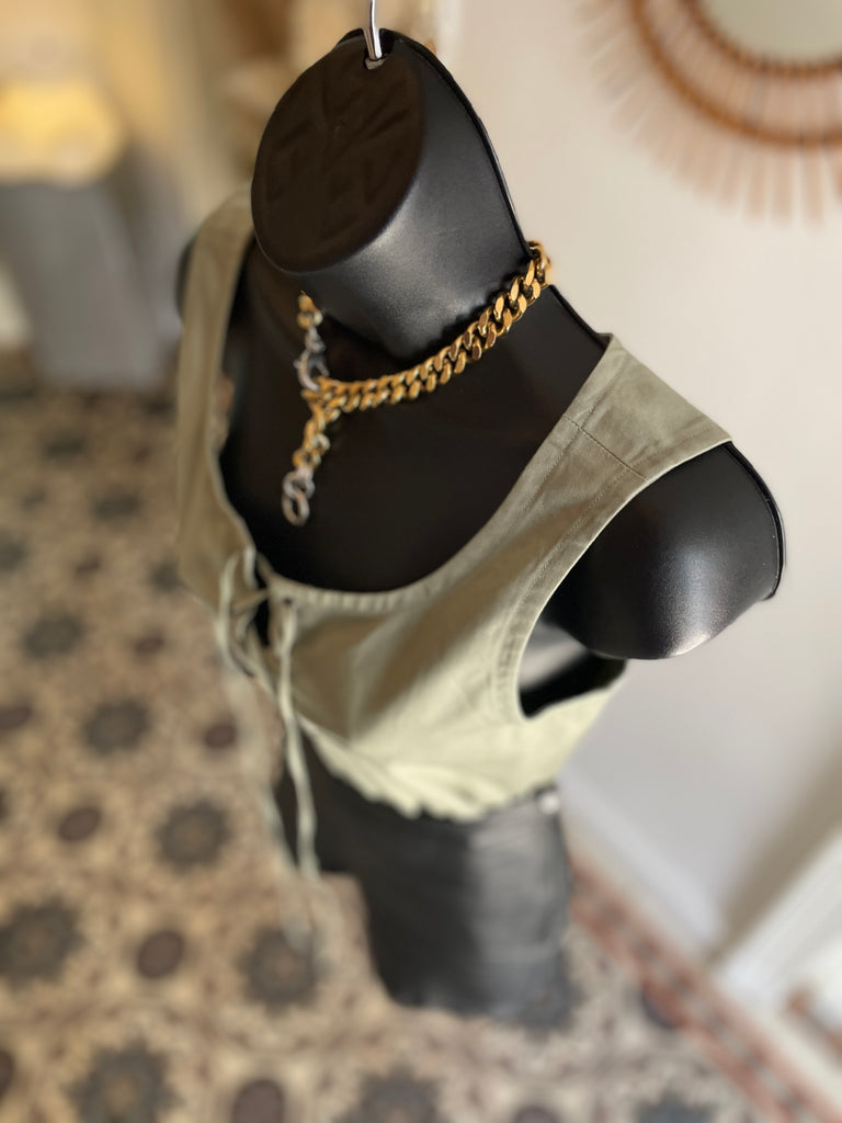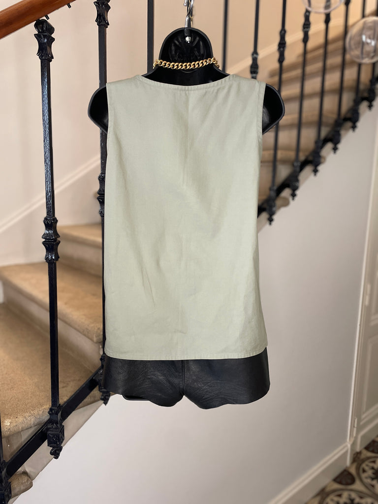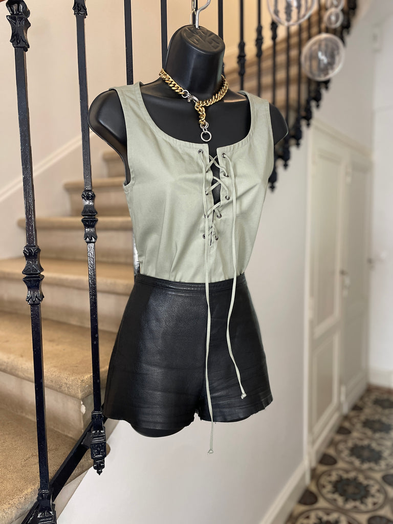 Débardeur en coton de couleur kaki clair. Coupe droite, décolleté avec laçage emblématique de la maison.